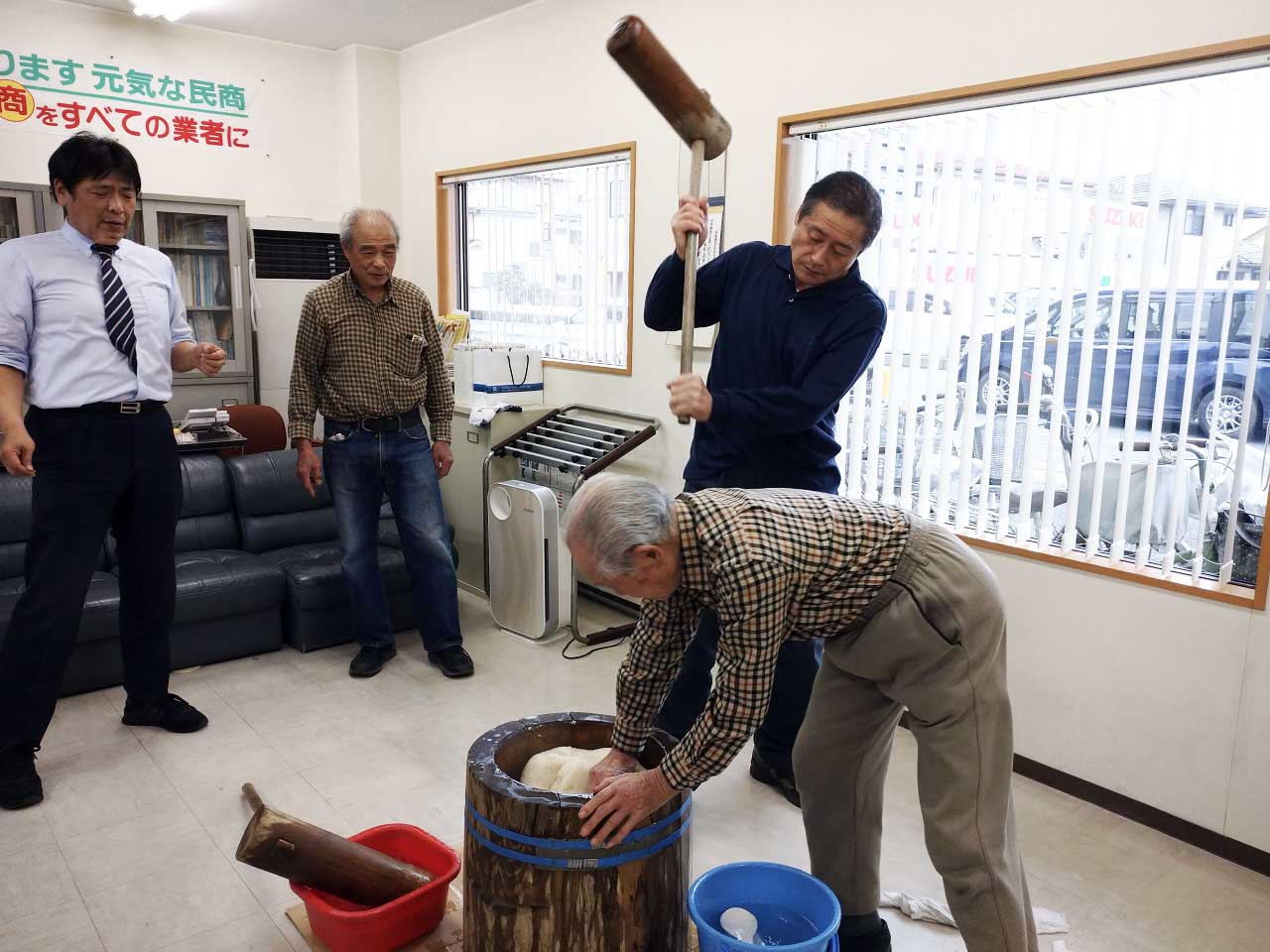 1月26日(日)、上尾民商事務所にて新春の餅つき大会・青旗開きを開催し26名が参加しました。餅つき大会は今年で3年を迎え、参加者の餅のつき方やこね方も年々上達してきている印象を受けました。今年は初参加の鎌田さん(洋菓子店)が素早く餅をひっくり返す姿に参加者も「手慣れた手つきですごい」と驚いていました。実は鎌田さん御年、93歳の上尾民商会員最高年齢で餅つきをとても楽しみにしていたとのこと。鎌田さんの奮闘する姿に合わせるようにつき手の小林さん(建築)、渡邉さん(建設設計)もテンポ良く杵を振るいました。出来上がったお餅は婦人部のお母さんたちが熱々のうちにあんこ・きなこ・大根おろし・納豆に味付けしてくれました。